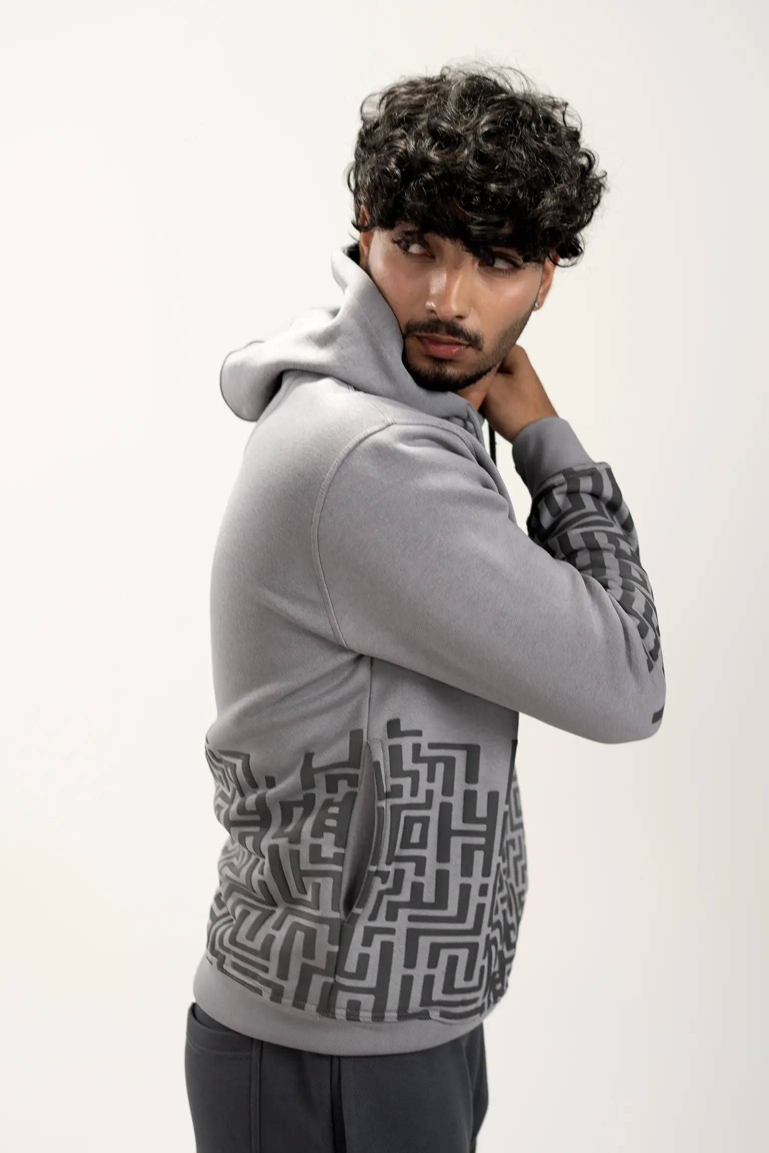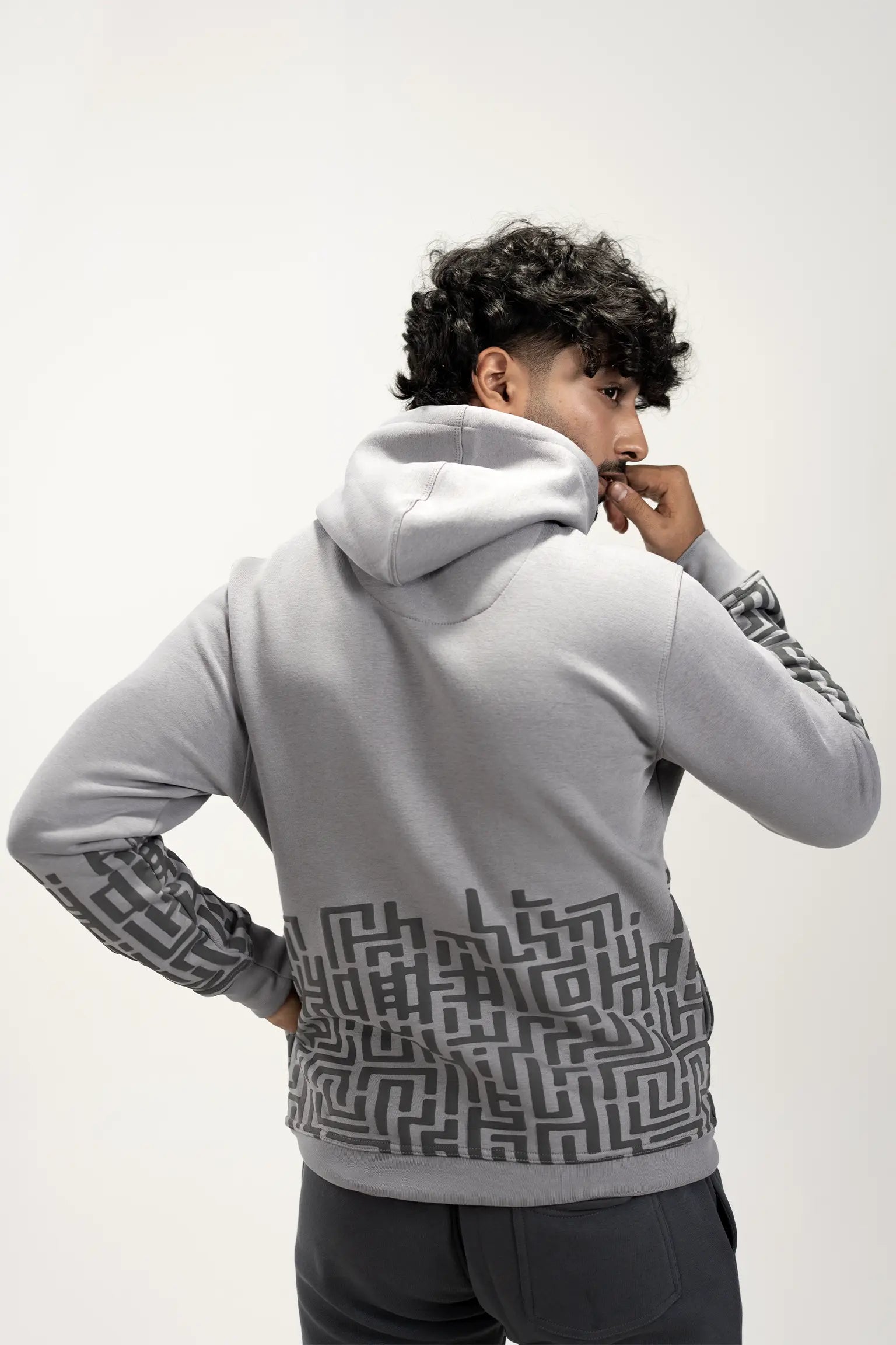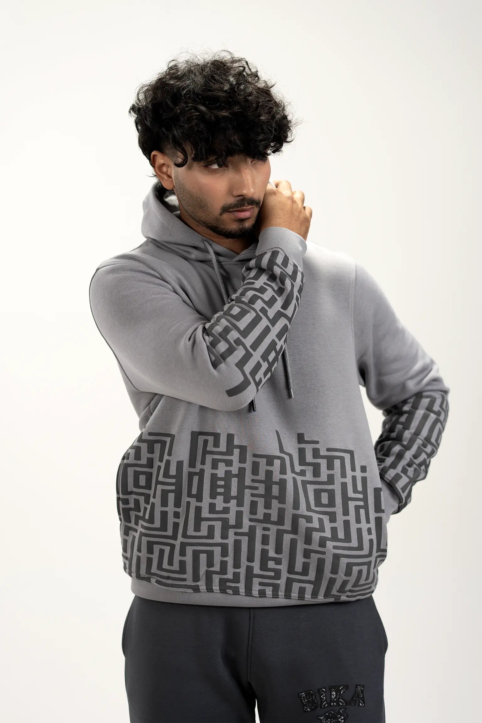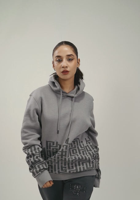 A graphic-heavy grey oversized hoodie with bold maze-inspired all-over print. 70% Cotton, 30% Polyester. Oversize hoodie with all-over maze print. 330 GSM/M².